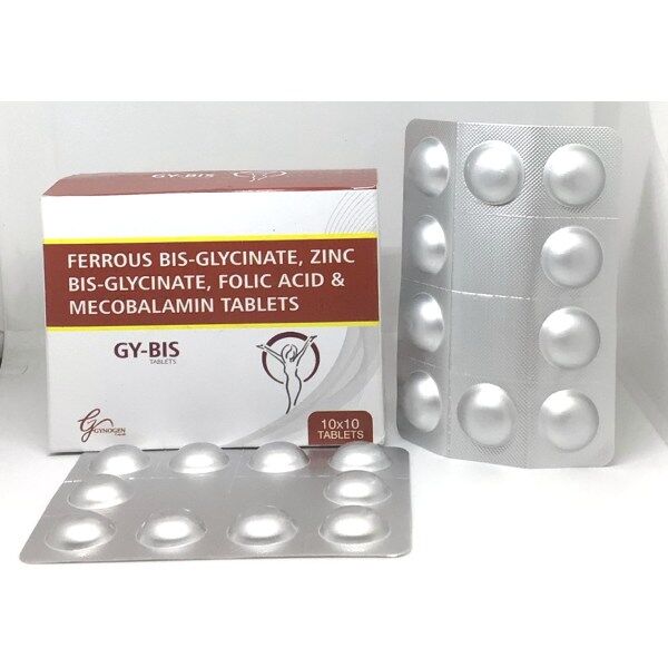 GY-BIS is a nutraceutical supplement that combines highly bioavailable chelated forms of Iron (Ferrous Bisglycinate) and Zinc (Zinc Bisglycinate) with Folic Acid and Methylcobalamin. It is specially formulated to treat and prevent iron deficiency anemia, support red blood cell formation, and improve overall nutritional status in pregnancy, lactation, and general fatigue.
